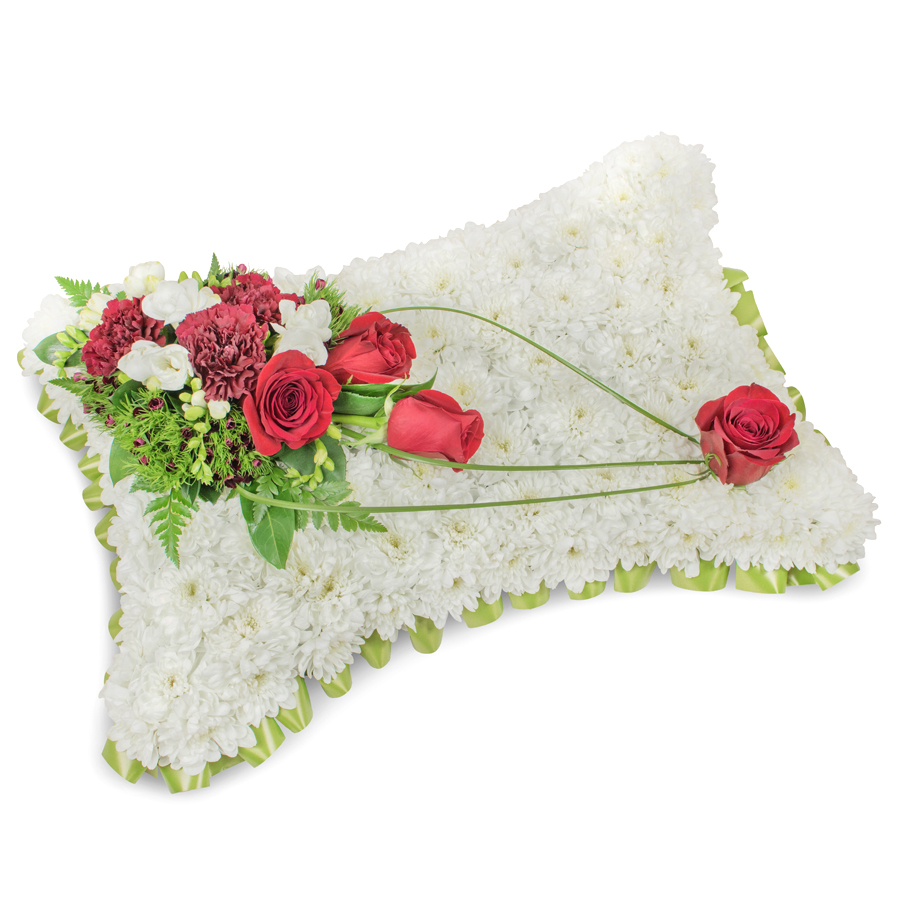 Deliver your deepest sympathies with our elegant flower arrangement. This unique bouquet includes white chrysanthemums, red roses, white freesias, dark red carnations, dianthus, and bear grass, each bloom hand-selected to ensure ultimate freshness and quality.